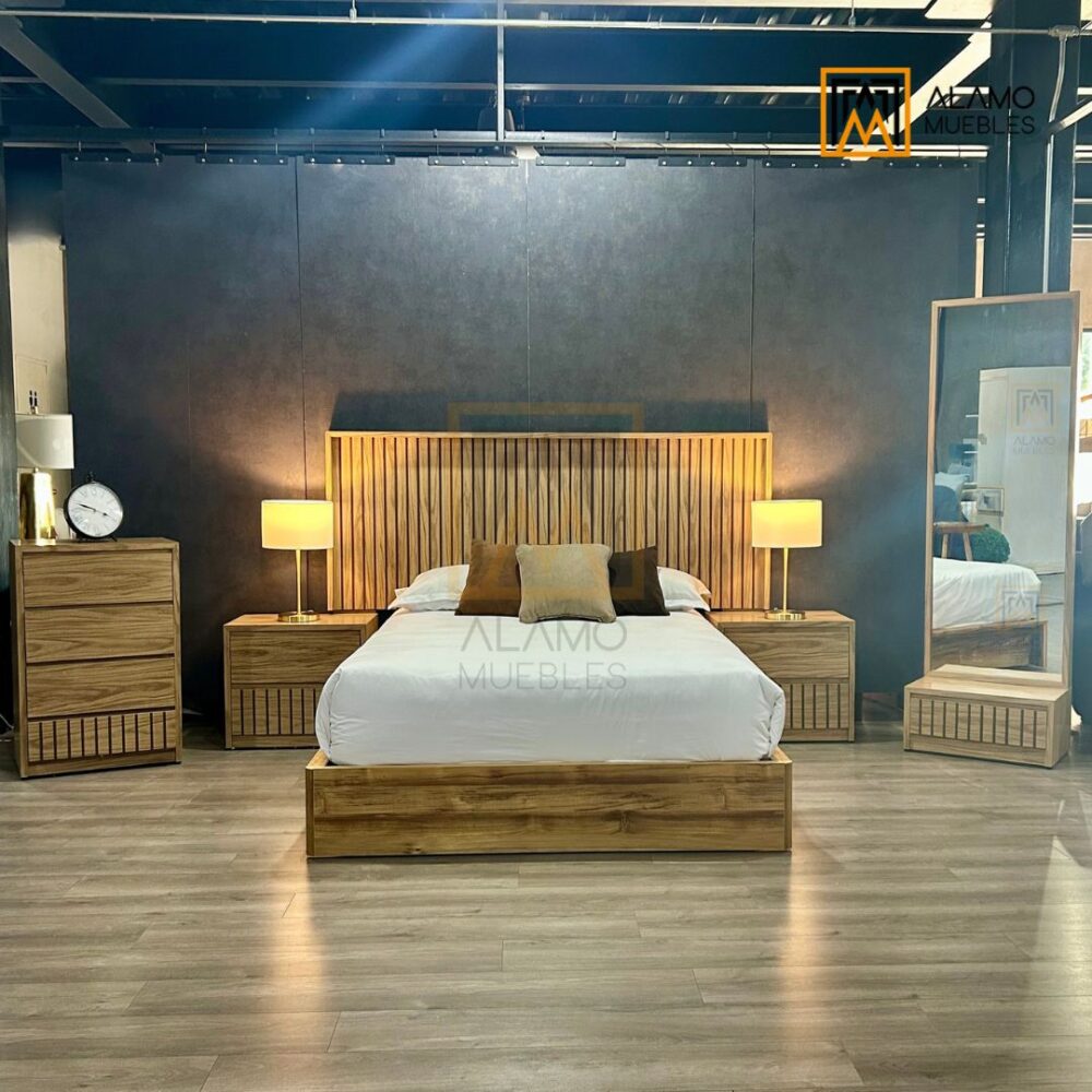 INCLUYE: 1 Cabecera Queen Size + 2 Buros + 1 Comoda + 1 Luna Espejo.