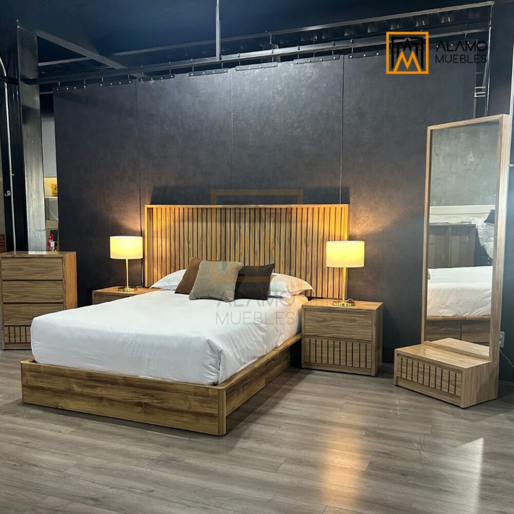 INCLUYE: 1 Cabecera Queen + 2 Burós + 1 Cómoda + 1 Espejo